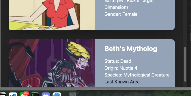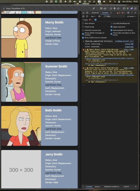 จาก โค้ดข้างต้นนะครับ ผมได้ทำการ fetch ข้อมูลใหม่โดยใช้ library SWR มา จากนั้นก็ทำการ เช็คเงื่อนไขตัวแปรที่ได้คืนมาจาก useSWR อย่าง loading และ data ว่ามีข้อมูลหรือป่าว ถ้าไม่มี ให้แสดงหน้า Loading แต่ถ้ามีก็ให้แสดง การ์ด ข้อมูล Rick & Morty