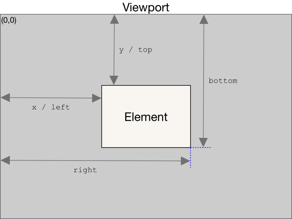 boundingClientRect – method ที่จะคืนค่า กรอบสี่เหลี่ยม ที่เป็น immutable ตามลักษณะของ DOMRectReadOnly โดยคำนวณจากหน้าจอ Viewport และ คิด ค่า border-width และ ค่า padding หากเป็น standard box โดย ค่าที่ return จะประกอบไปด้วย left, top, right, bottom, x, y, width, and height ใช้ในการอธิบายตำแหน่งและขนาดของกล่องสี่เหลี่ยม
